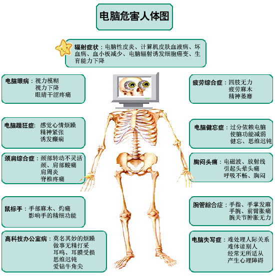 电脑对人体的危害主要有以下11种: 辐射症状:电脑性皮炎、计算机皮肤血液病、坏血病、血小板减少、电脑辐射诱发细胞癌变、生育能力下降。 电脑眼病:视力模糊;视力下降;眼睛干涩疼痛。 电脑躁狂症:感觉心情烦躁;精神紧张焦躁不安;诱发癫痫。 颈肩综合症:颈、肩部酸痛;颈部转动不灵活;肩周炎、脊椎疼痛。 鼠标手:手部麻木、灼痛;影响手的精细功能。 高科技办公室病:莫名其妙的烦躁;做事无精打采;耳鸣、耳膜受损;思维迟钝;爱钻牛角尖。 疲劳综合症:四肢无力;疲劳麻木;精神萎靡。 电脑健忘症:过分依赖电脑;使脑功能减弱;健忘、思维迟钝。 胸闷头痛:电磁波、放射线刺激引起头晕头痛;导致呼吸不畅、胸闷。 腕管综合症:手指、手掌发麻;手腕、前臂胀痛;腕关节肿胀无力。 电脑失写症:人际关系处理困难;难以体谅别人;经常无所适从;产生严重心理障碍。 目录 眼镜族 保健操 防辐射验方 食疗大法 液晶更伤眼 药水慎着用 美丽的距离 眼镜族护眼 在电脑屏幕前工作时间长了,眼睛就抗议:流泪、异物感、视物不清甚至视力下降。专家认为,不妨戴上旧眼镜以求眼睛不至于因调节过度导致疲劳永久伤眼。旧眼镜的度数最好比新眼镜度数相差125度。 专家提醒说, 配了新眼镜,旧眼镜别忙着丢掉。一般来说,要是旧眼镜比新眼镜度数少125度,那戴着来看电脑就最合适不过了。正常人的眼睛天生有“调节力度”,原则上,看远处时基本不用调节,当物体移动靠近到5米以内时,就必须通过眼睛调节才能看得清楚。视物对象越向眼前移动,眼睛使用的调节力度就越大,使近处的物体能看得清楚。 经常“近距离”视物,眼睛的调节度被“高频使用”,晶体、睫状肌和悬韧带三者长时间处于紧张状态,引发流泪、异物感等不适感。因此,适当把视近物时的近视眼镜度数减低125度,大有好处。 保健操 为什么眼睛常感到干涩、疲劳?这是长时间盯着电脑屏幕或隐形眼镜族常见的困 扰。据统计,一天在电脑屏幕前工作3小时以上的人,有八成人会有眼睛疲劳、头疼、肩颈酸痛,久了还可能导致干眼症的发生。眼科医生建议,要保护心灵之窗,除了平日多吃一些明目的食物外,还可以做做“明目操”。 下面介绍几招简便易行,行之有效的眼部保健操: 1.电脑MM的“去皱明目操” 让MM手把手地教你正确的眼周穴位揉按法。 2.简单易学的眼部按摩法 只需几步,眼纹byebye 防辐射验方 1. 电脑旁放盆仙人掌 2.安居家系列电脑专用消除电脑辐射节能转换器 3.绿茶也可以防辐射 4.穿防辐射服是最直接的了,:) 5.不要长时间看电脑,多喝绿茶,常洗脸. 6.最简单的方法就是洗脸咯~!每次用完电脑的时候都洗一次,还可以防止脸上长斑斑喏! 7. 多喝水、带眼镜 8. 使用电脑辐射消除器可以消除电脑90%以上辐射. 9. 使用液晶显示器,可以防辐射 10. 我每天都喝绿茶,还有就是每天吃点螺旋藻,可以很有效的防辐射 11. 日本有售一种小小的标贴,贴在电脑或手机上,防止幅射的,小小的,但是价格很贵,国内不知道有没有 12.贴个保湿面膜在脸上,相对来讲也可以抵挡一下幅射吧,虽然没什么科学依据,但一边保温一边用电脑对皮肤有益无害。另外也可以用一会电脑就休息一会儿,劳逸结合也可避免太多幅射! 13. 竹炭也可以起到防辐射的作用哦~~ 14. 购防辐射服及附件!! 15. 在用电脑之前,涂点防晒霜可以防辐射。 16.空气熏香,可以很好的起到防止辐射的问题.主要原理是,中和阳离子. 17.呵呵,我提个最简单的建议:在电脑前坐一段时间以后,脸会很热,有紧绷的感觉,这时候可以用手撮一下脸,可以缓解症状,减轻连续辐射带来的影响.再用手轻压眼睛,可以解除眼部疲劳. 18. 长时间盯电脑,会产生油脂,要经常洗脸。或是加上屏保。 19. 用隔离霜,经常洗脸,多喝枸杞泡绿茶,适当吃些有助缓解眼部疲劳的食品或保健品。 20. 听说喝菊花茶可以防辐射的,大家可以试试啊.呵呵. 21. 还有一种天然水晶簇摆件,可以防辐射哦.在电脑旁多摆几个吧~~! 22.海带是食物中最防辐射的.要多吃海带哦!又经济效果又好! 23. 花粉可以防辐射! 24. 普洱茶可以防辐射,原因如下: 在中国的众多的茶区中云南为中国一类茶区,由于云南当地土壤资源优秀,气候适宜,雨水丰富,非常适合茶叶的生长。且普洱茶采用云南的大叶种茶树,其茶叶中内涵物质丰富饱满,其中云南茶产区大茶树的茶多酚含量均达到30-34%,儿茶素总量达到18-24%,且其耐泡,茶浸出物达46-50%,对抗辐射无疑是有很大的作用。 25. 最简单的食物抗辐射法:海带的提取物海带多糖可减轻同位素、射线对机体免疫功能的损害,并抑制免疫细胞的凋亡而具有抗辐射作用。能抗辐射的蔬菜还有:黑木耳、油菜、青菜、芥菜、卷心菜、萝卜等。 26. 电脑旁边放一盆吊兰!!! 食疗大法 我们的眼睛能够看的见东西是因为眼睛有网膜,而视紫是网膜的感光物质,也就是在光线照射下视紫会产生化学反应而产生一个讯号,透过神经传导到大脑,才完成看的动作。但随着用眼的过度、外界的刺激、紫外线的照射等因素,使得眼睛产生提早老化、眼睛过干而疲劳酸涩、眼球最外层组织受损、视神经传导迟缓等问题,除了透过眼科医师的诊疗及执行正确使用计算机的8大法则外,其实补充眼睛必需要的营养素,在保护眼睛的过程中也是非常重要的。 1、眼睛疲劳的食补 眼睛过干、缺乏粘液滋润易产生眼睛疲劳的现象,维生素A